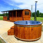 - Fiberglass hot tub with integrated stove, hydro massage, air massage, and LED lighting